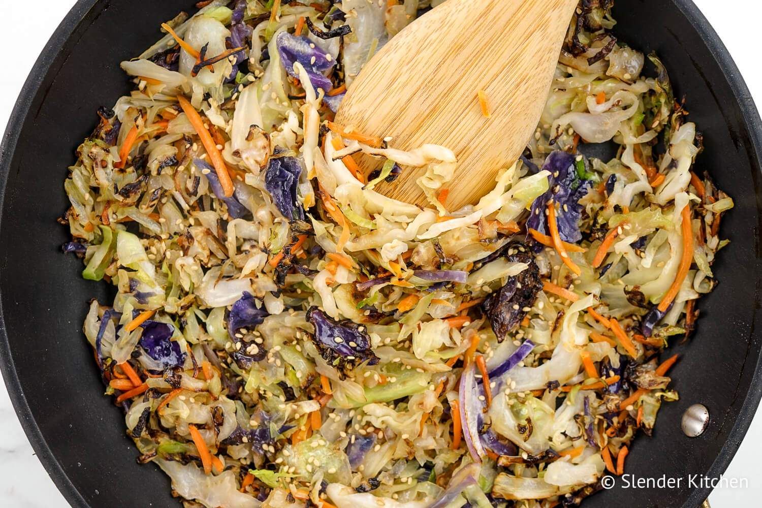 Chop the coleslaw veggies up a bit more and place them in a saute pan with the bone broth. Cover with a lid and steam on medium heat for 5-6 minutes. Drain excess broth. Add butter to the pan and Nature’s Seasoning and salt and pepper. Saute for another 3-5 minutes. If you are using this for a stir fry “rice,” add the coconut aminos (wonderful, healthier soy sauce substitute) for this last few minutes of cooking. If you are using this as a base for meat and gravy type dish or a side dish, top with nutritional yeast (nutty, Parmesan cheese-like taste) to taste. You can use this to mix in with rice to add more vegetables and fiber to a meal if you desire.